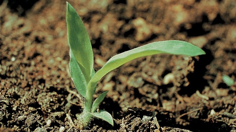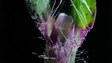 Csíranövény: A csíranövény levéllemeze mindkét oldalán szőrökkel fedett. Színe gyakran pirosas-ibolyás, a középső ér is pirosas árnyalatú. Az első levelek rövidek, hegyesek, alakjuk tojásdad. Fülecskéjük nincs.