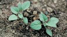 Csíranövény: A hosszú, mirigyszőrös levélnyéleken ülő sziklevelei széles lándzsásak, csúcsuk kihegyezett, az alapnál kissé szív alakúak. A sziklevél a fonákon szürkéslila. A sziklevél alatti szárrész violaszínű, rajta apró mirigyszőrök láthatók.
