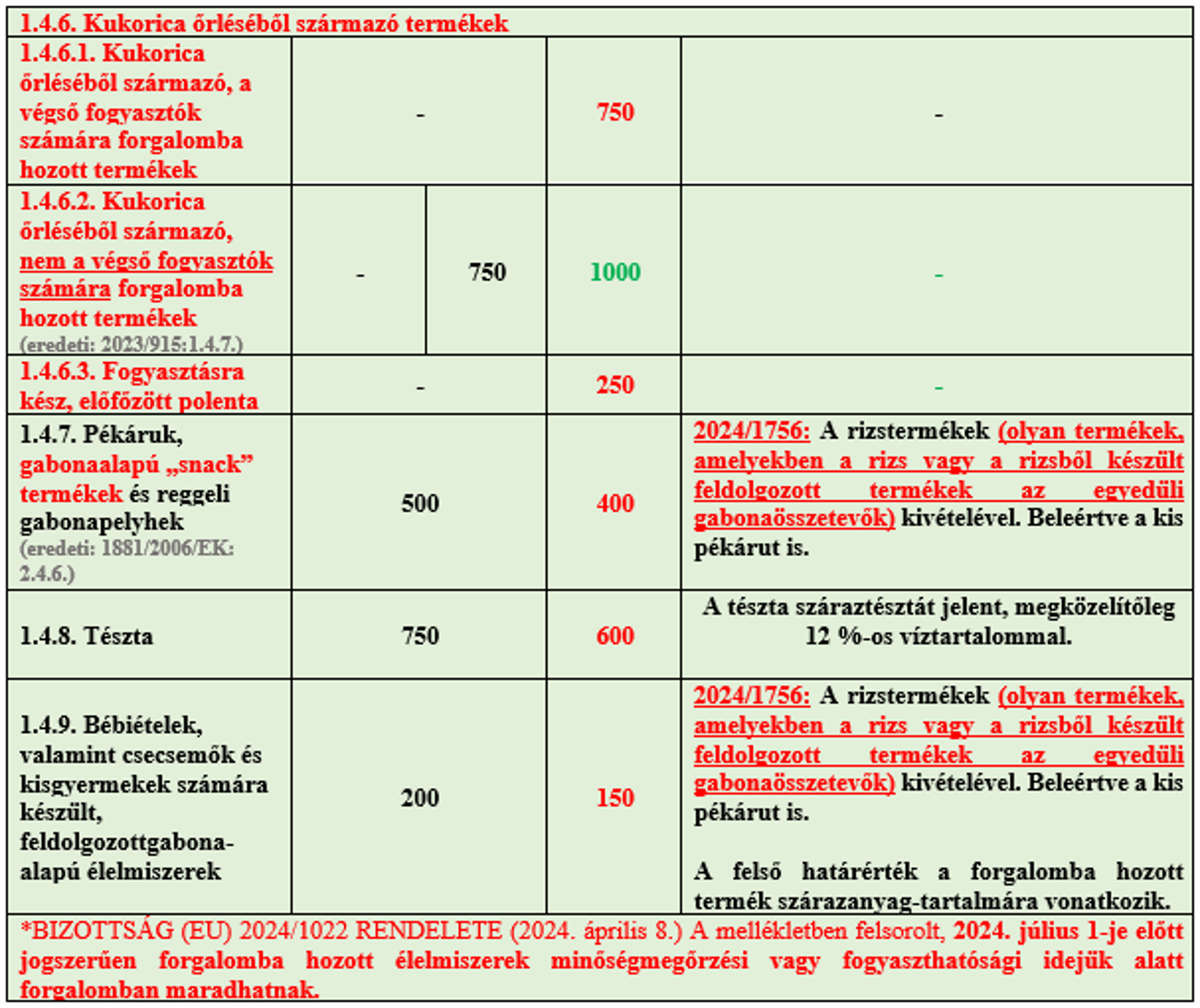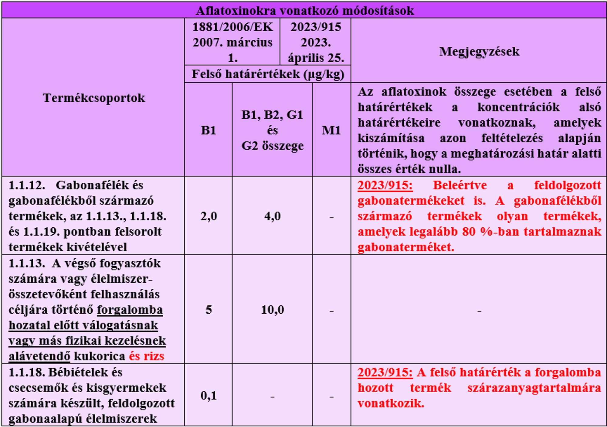 A gabonafélék aflatoxin határértékeit és a módosításokat az 1. táblázat tartalmazza.