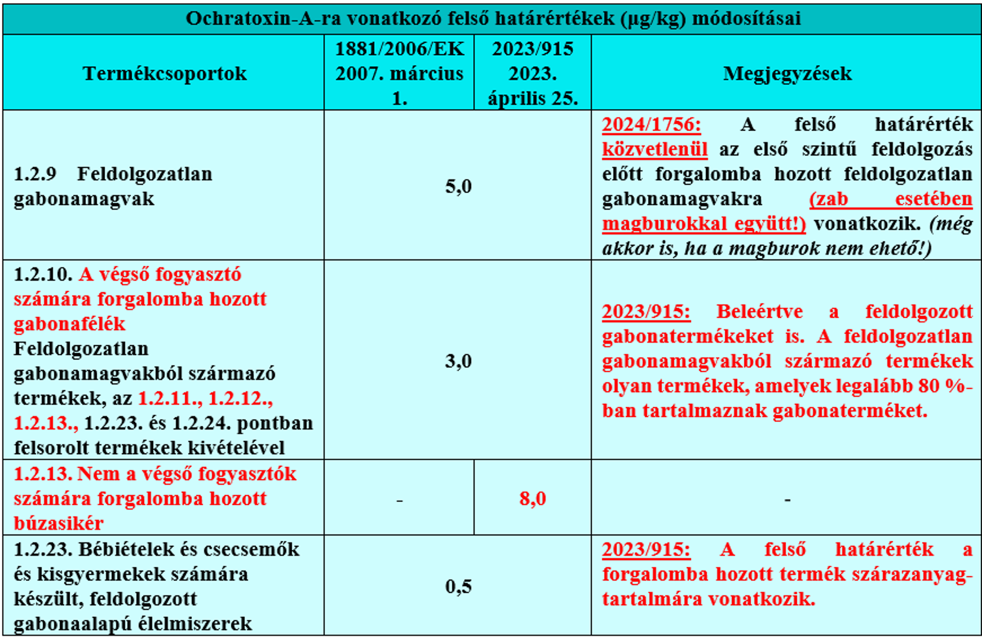 A gabonafélék ochratoxin-A határértékeit és a módosításokat a 2. táblázat tartalmazza.
