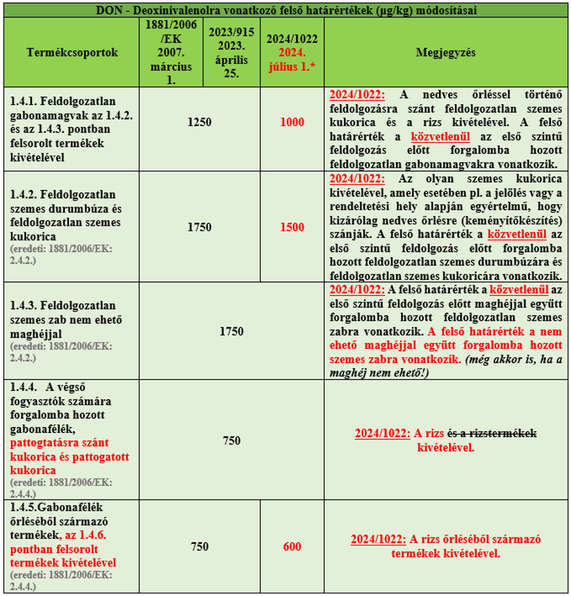 A gabonafélék deoxinivalenol (DON) határértékeit és a módosításokat a 3. táblázat tartalmazza.