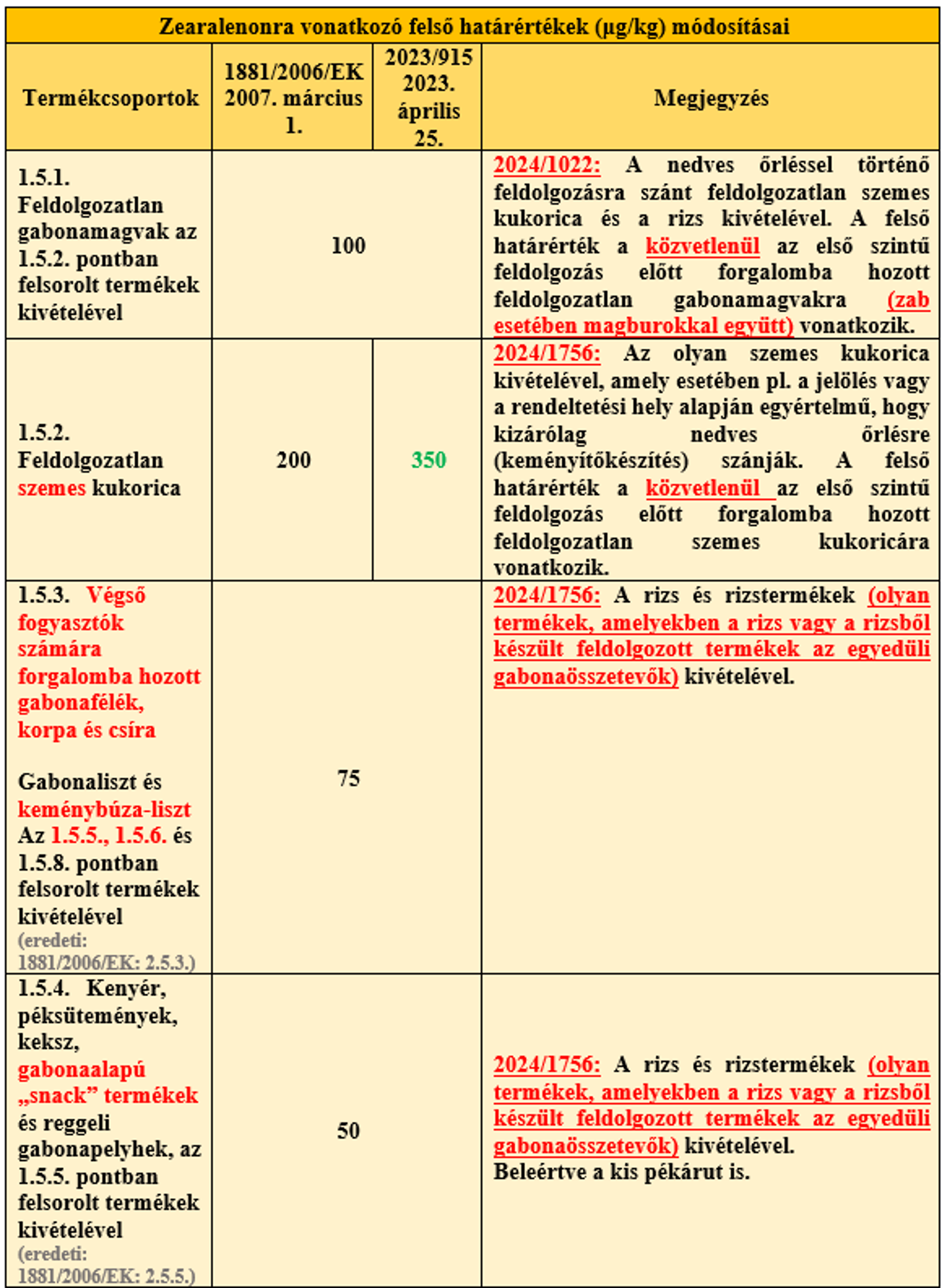 A gabonafélék zearalenon határértékeit és a módosításokat a 4. táblázat tartalmazza.