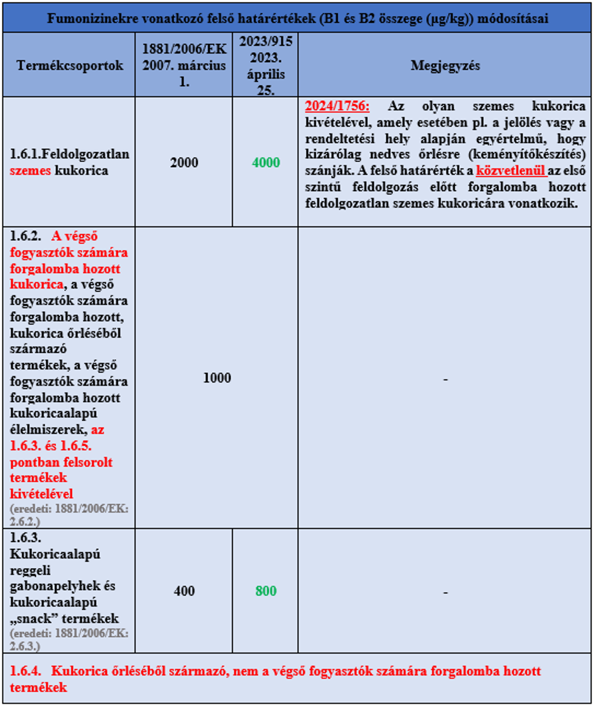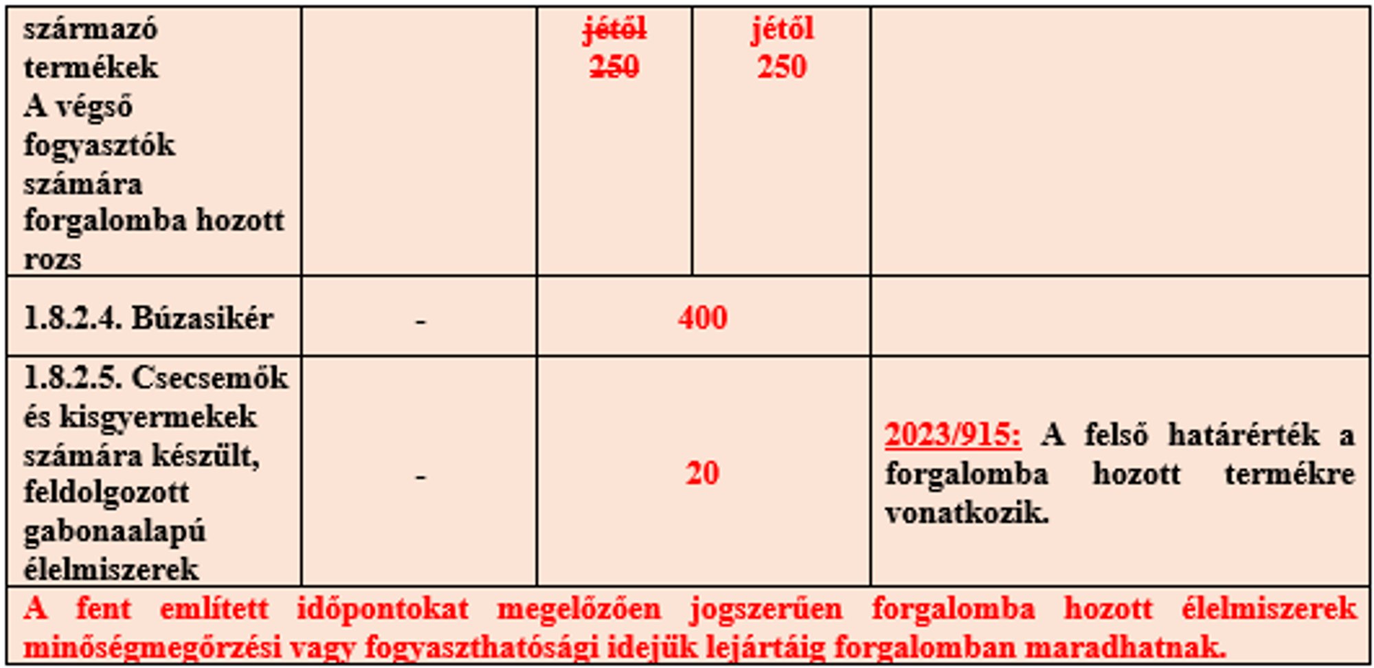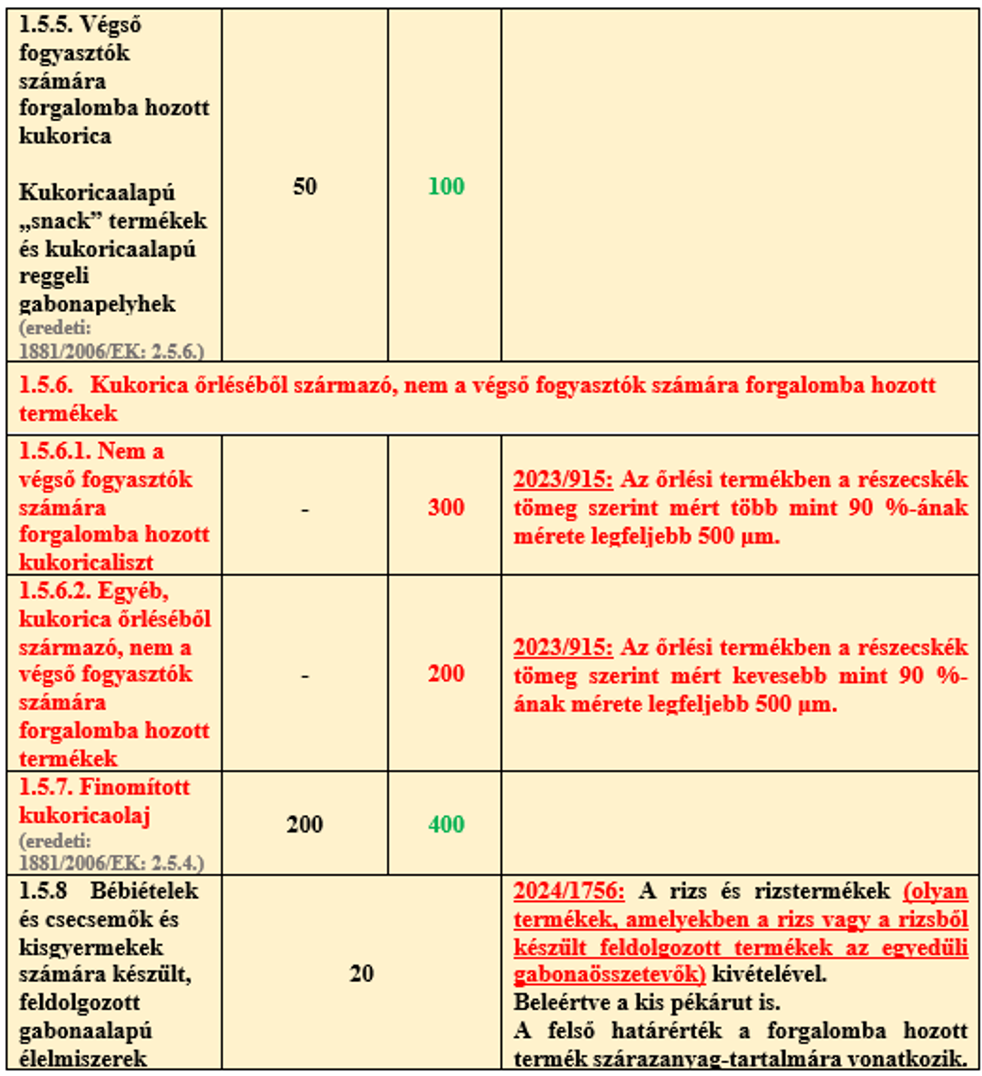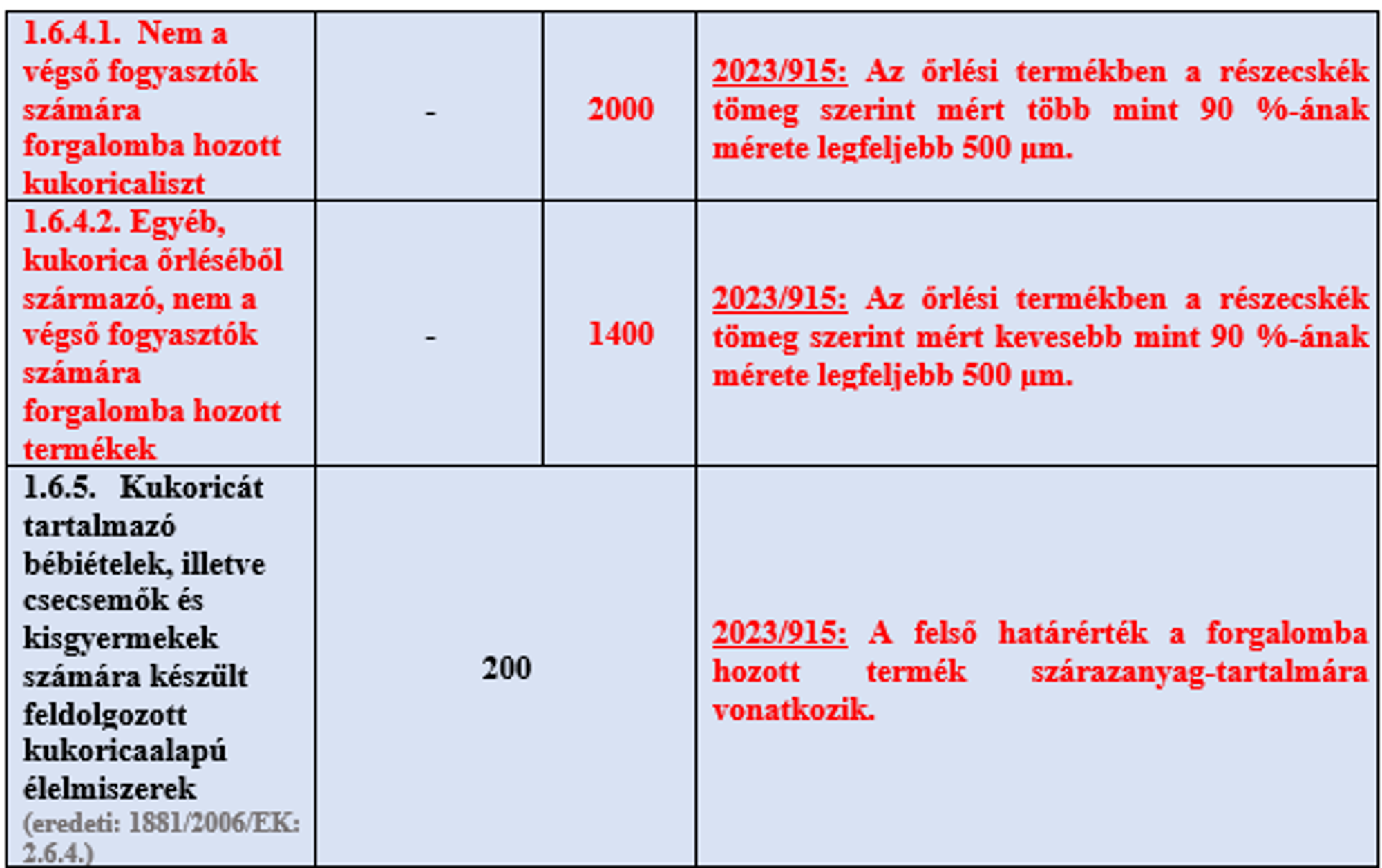 2023-ban jelent meg az élelmiszerekben előforduló egyes szennyező anyagok felső határértékeiről szóló (EU) 2023/915 bizottsági rendelet, amely az 1881/2006/EK rendeletet váltotta fel. Ezen rendelet tartalmazza – többek között – a gabonafélék mikotoxin határértékeit. Az új bizottsági rendelet is folyamatos felülvizsgálat alatt van, 2024-ben számos módosítása jelent meg.