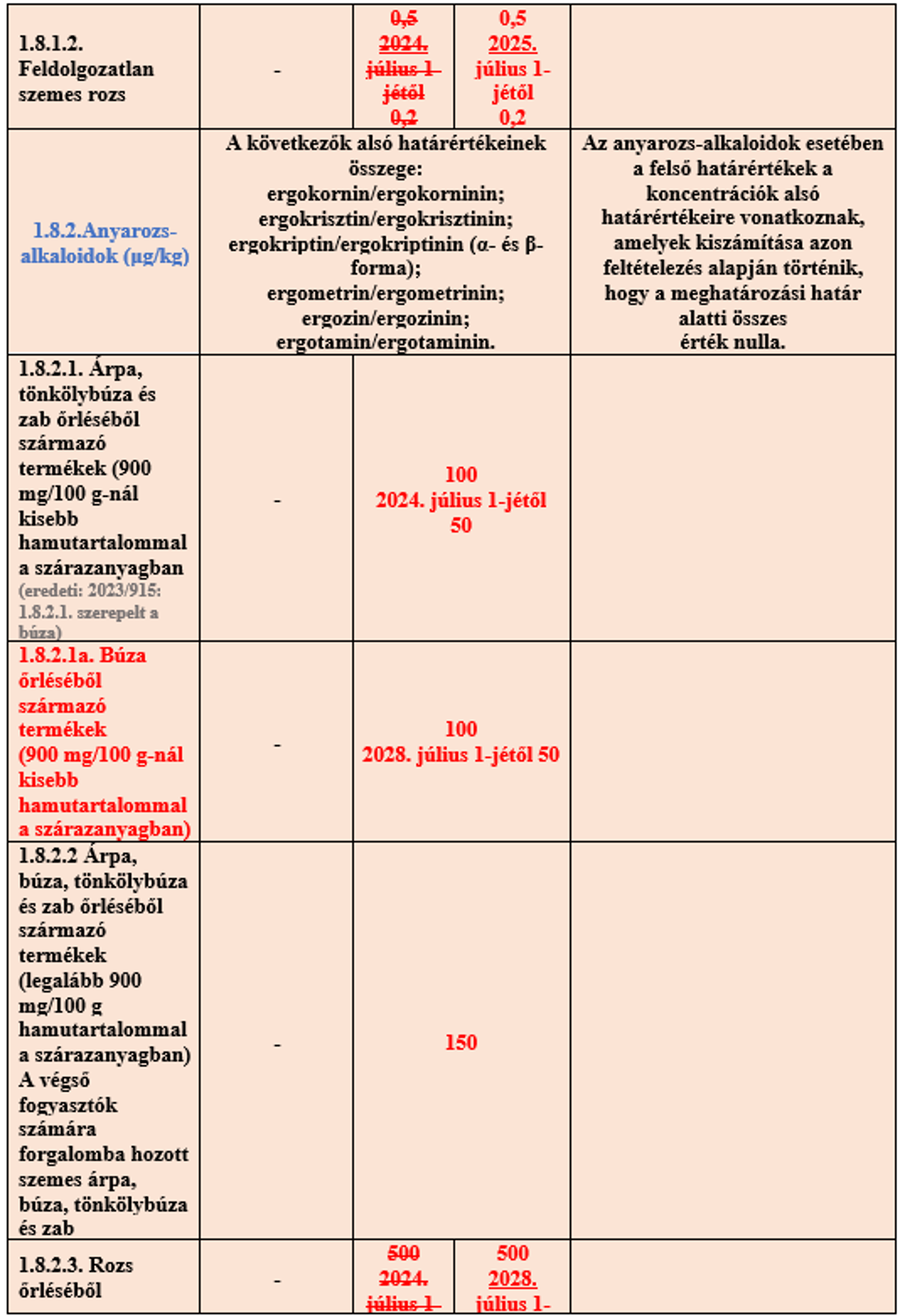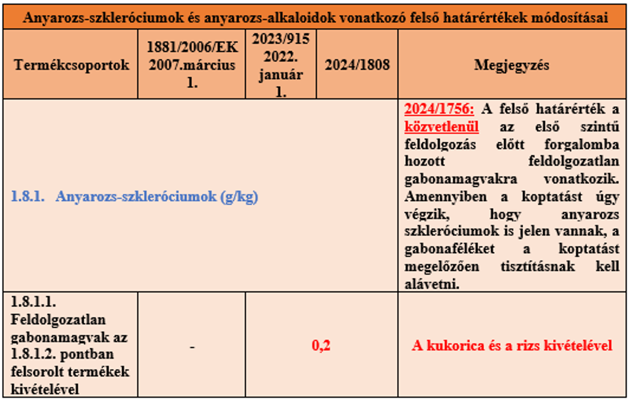 A gabonafélék anyarozs-szkleróciumok és anyarozs-alkaloidok határértékeit és a módosításokat a 6. táblázat tartalmazza.