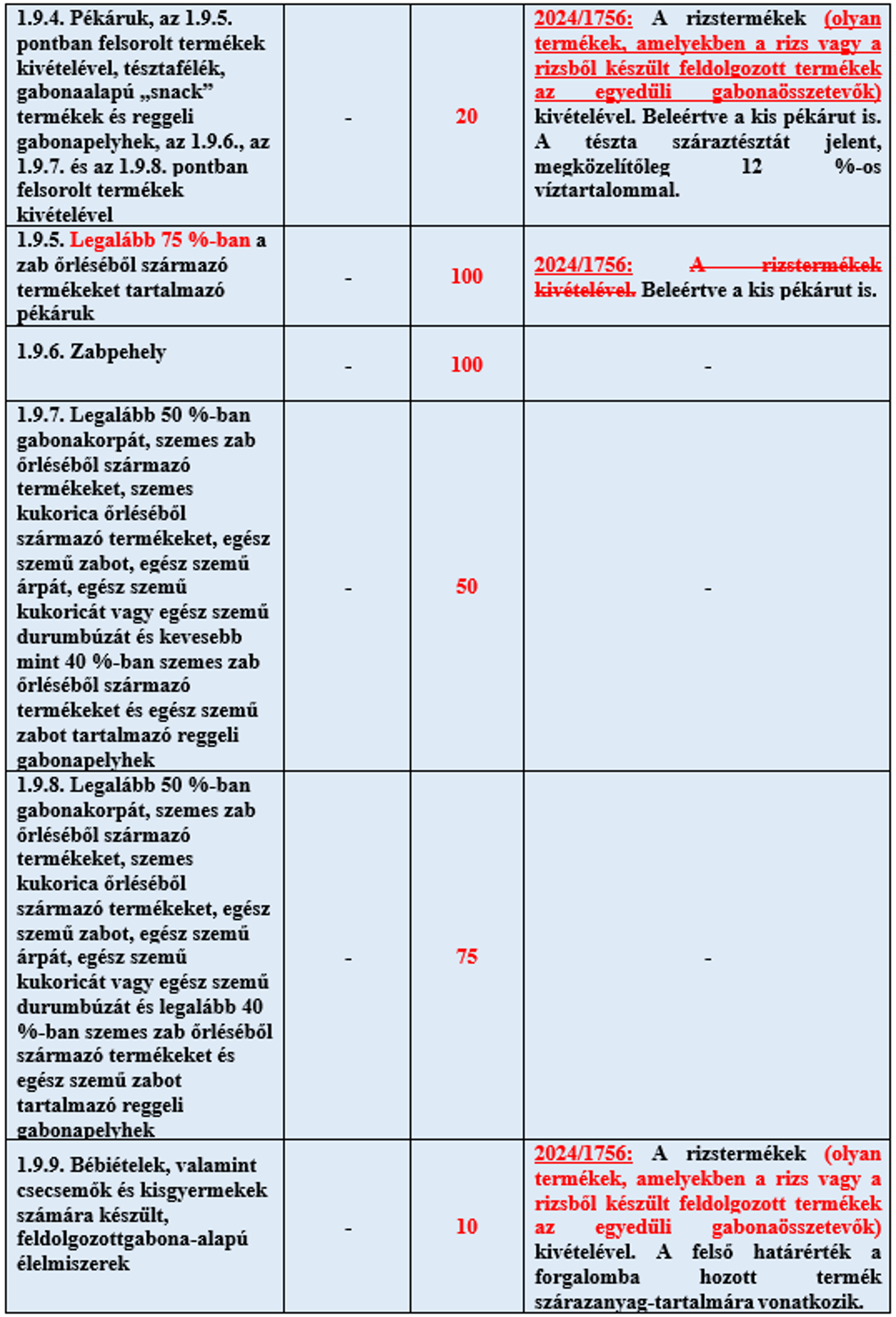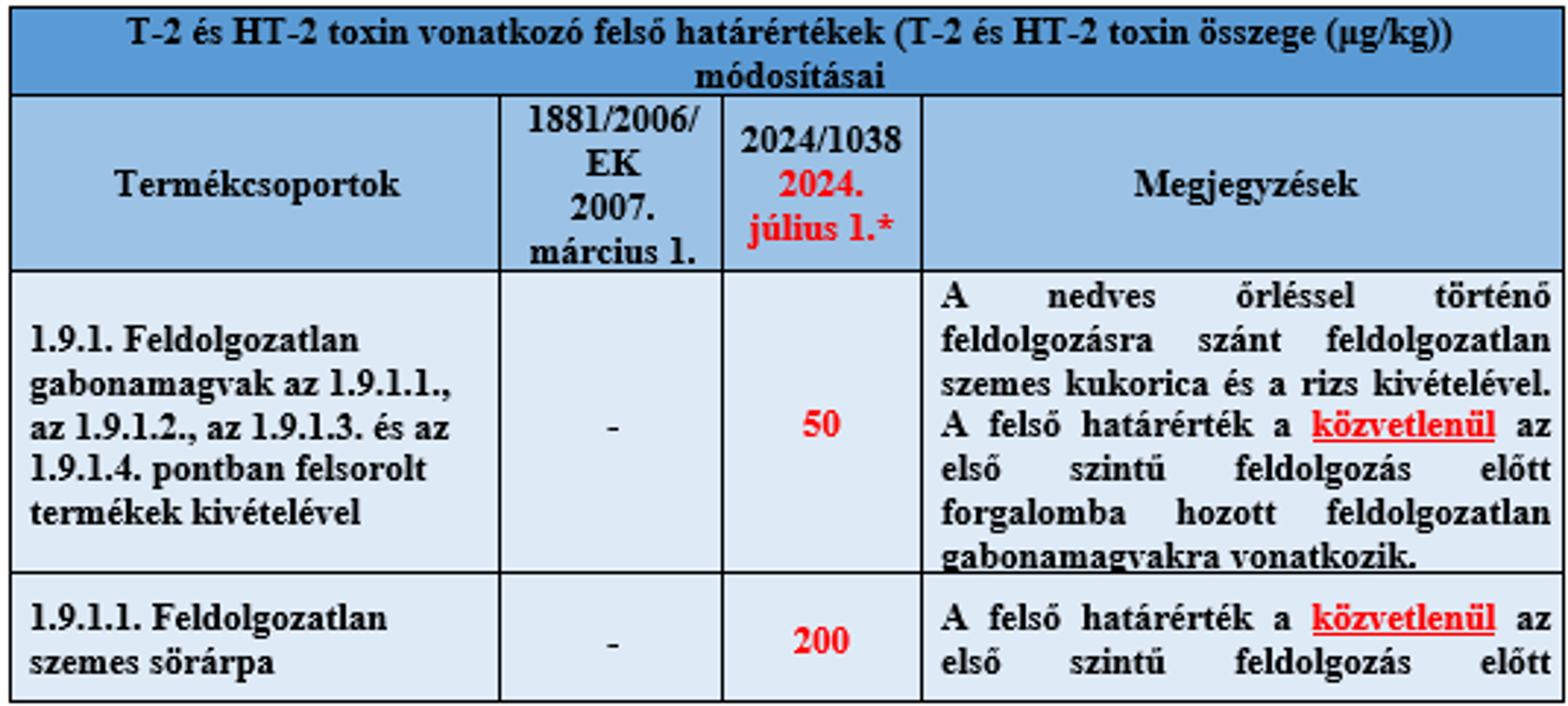 A gabonafélék T-2 és HT-2 toxin határértékeit és a módosításokat a 7. táblázat tartalmazza.