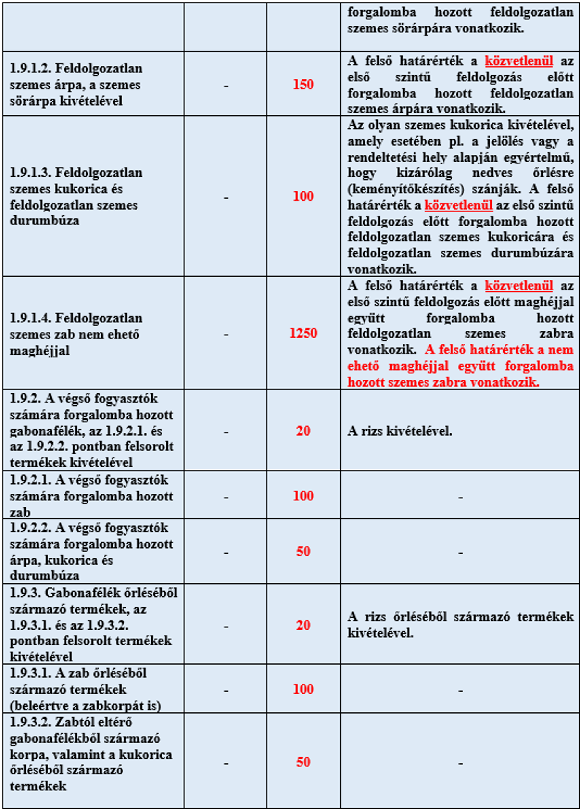 A bizottsági rendeletben az ochratoxin-A, a DON, a zearalenon, a fumonizinek, az anyarozs-alkaloidok, a T-2 és HT-2 toxinok esetében pontosításra került a feldolgozatlan gabonamagvaknál szereplő megjegyzés; a felső határérték közvetlenül az első szintű feldolgozás előtt forgalomba hozott feldolgozatlan gabonamagvakra vonatkozik és zab esetében a nem ehető maghéjjal együtt forgalomba hozott szemes zabra vonatkozik.