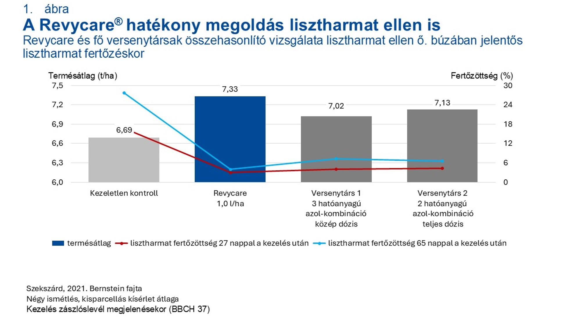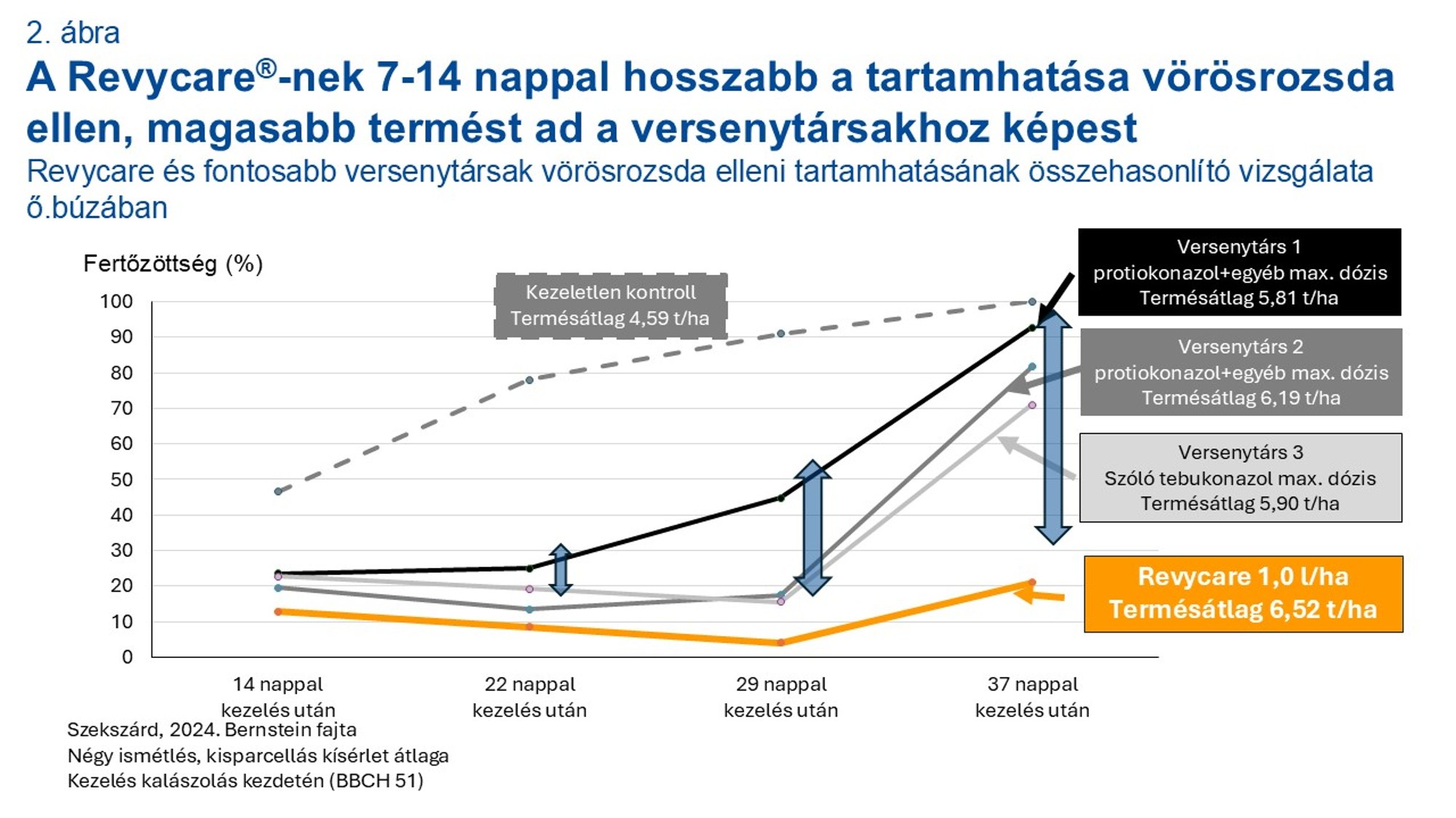 A Revycare® 1,0 l/ha adagját javasoljuk a zászlóslevél védelmére, hiszen hosszú a hatástartama, fokozza a fotoszintézist, emiatt sokáig egészségesebbek és zöldebbek lesznek a termést meghatározó felső levelek. (2. ábra)