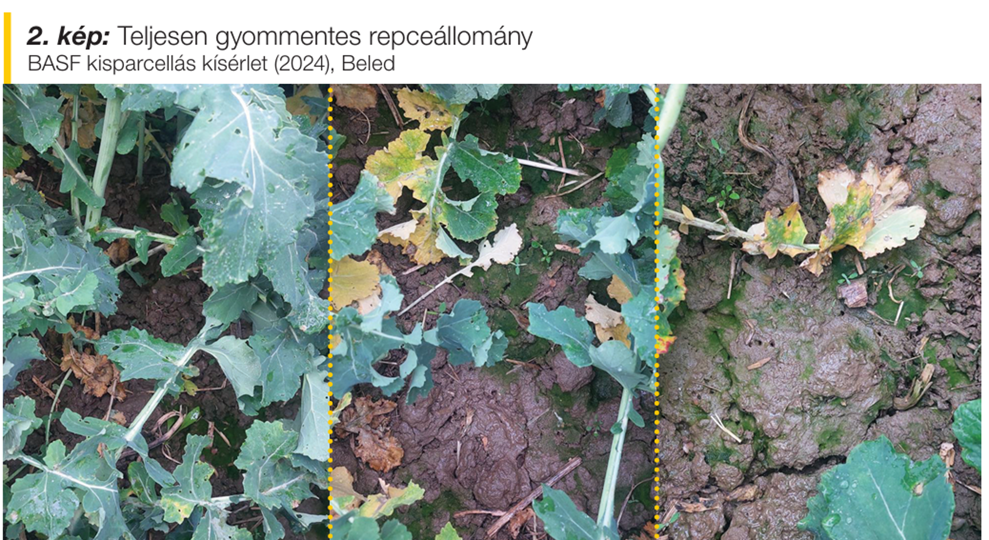 Repcegyomirtó szereinknek tehát minimálisan biztosítania kell az érzékeny fejlődési szakaszban az állományaink gyommentesen tartását, megfelelő előnyt biztosítva ezáltal a kultúrnövény számára. A Butisan® Complete gyomirtó szerünk erre tökéletesen alkalmas, hiszen a repcében károsító, valamennyi fontos gyomnövény ellen hosszú hatástartamot biztosít az állomány záródásáig (2. kép).