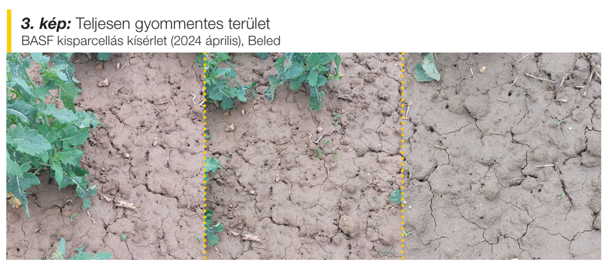 A Butisan® Complete, azonban még ennél is sokkal többre képes. A kísérleti területet április elején bejárva azt tapasztalhattuk, hogy azok a foltok, ahol a repceállomány nem volt képes zárt állományt alkotni, ilyen-olyan okok miatt, a Butisan® Complete-tel történt kezelés hatására a gyomok ott sem voltak képesek felszaporodni, akár preemergensen, akár korai posztemergensen történt a növényvédő szer kijuttatása (3. kép).