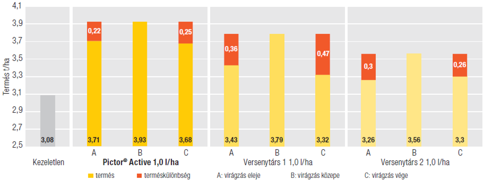 Ezek a különbségek egyértelműen látszanak abban az esetben is, ha többéves adatsorokat vetünk össze. A beledi kísérletek hároméves eredményeit kielemezve látható, hogy a teljes dózisú kezelések a virágzás közepén kijuttatva adták a legnagyobb különbséget a kontrollparcellák terméseredményeihez képest. A kezeletlenhez visznyítva közel egy tonna terméstöbbletet sikerült realizálnunk a Pictor® Active segítségével. Ez a terméstöbblet majdnem tíz százalékkal bizonyult magasabbnak, még a legjobb versenytárs készítményhez képest is, nem is beszélve a gyengébb versenytársak eredményeiről, melyek lényegesen elmaradtak a Pictor® Active teljesítményétől. (1. ábra)