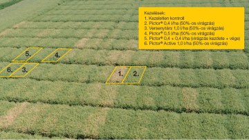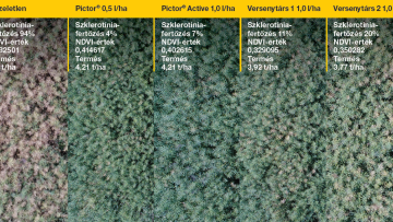 Ilyen jelentős fertőzési nyomás esetén, még optimálishoz közeli körülmények között is (amikor megfelelő időzítésben a virágzás közepén, az ajánlott maximális dózisokban juttatjuk ki a szereket) megmutatkozik az egyes kezelések közti különbség abban, hogy milyen hatékonysággal voltak képesek visszaszorítani a gombabetegség támadását, és ezáltal mennyi termést tudtak megvédeni. Ha megnézzük madártávlatból a kísérleti helyszínt, messziről kitűnnek a kezeletlen parcellák, valamint a gyengébb kezelések is, a Pictor® és a Pictor® Active-val kezelt parcellák haragoszöld színéhez képest (2. kép).