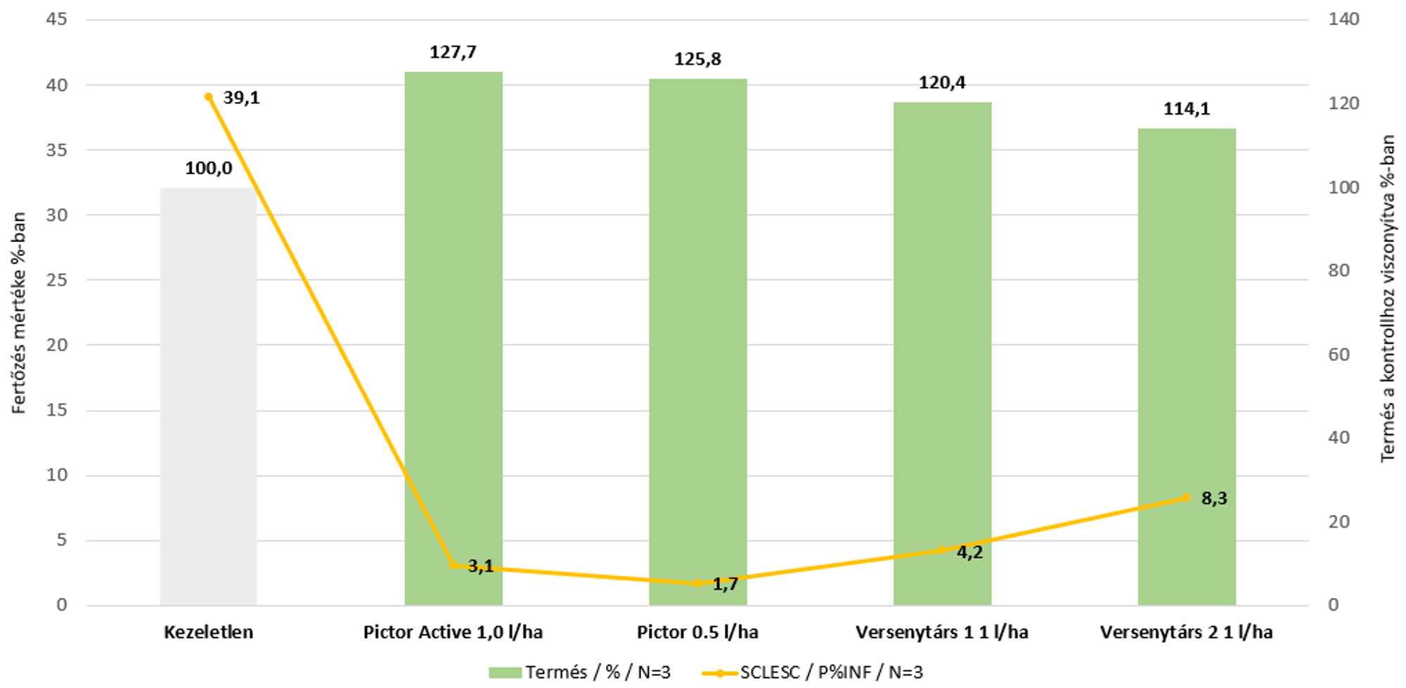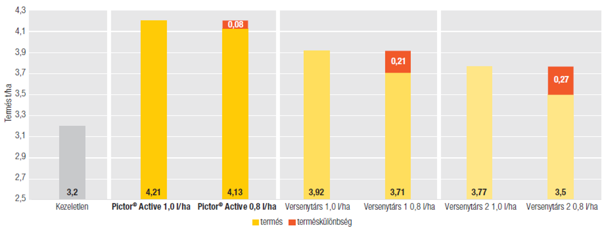 Nagyon hasonló eredményeket kaptunk abban az esetben is, amikor az ajánlott maximális dózist csökkentettük 20%-kal. Ilyenkor azt láthatjuk, hogy a Pictor® Active hatékonysága egészen minimális mértékben csökkent, szemben a versenytársakkal, hiszen ezek a gombaölő szerek drasztikus hatékonyságcsökkenést mutattak, ami termésmennyiségben is egyértelműen megmutatkozott (3. ábra).