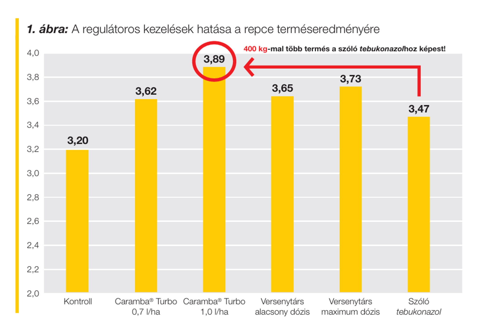 Összességeben elmondható tehát, hogy az őszi káposztarepce regulátoros kezelésére a legjobb választás a Caramba® Turbo 0,7–1,4 l/ha-os dózisa ősszel, a repce 4–6 leveles állapotában, tavaszszal pedig a szárba indulás előtt vagy a legelején kijuttatva. Használatával biztosíthatjuk az egészséges növényállományt ősztől a virágzás kezdetéig, valamint növekedésszabályozó hatása segít minél jobban kihasználni a növény maximális termőképességét.