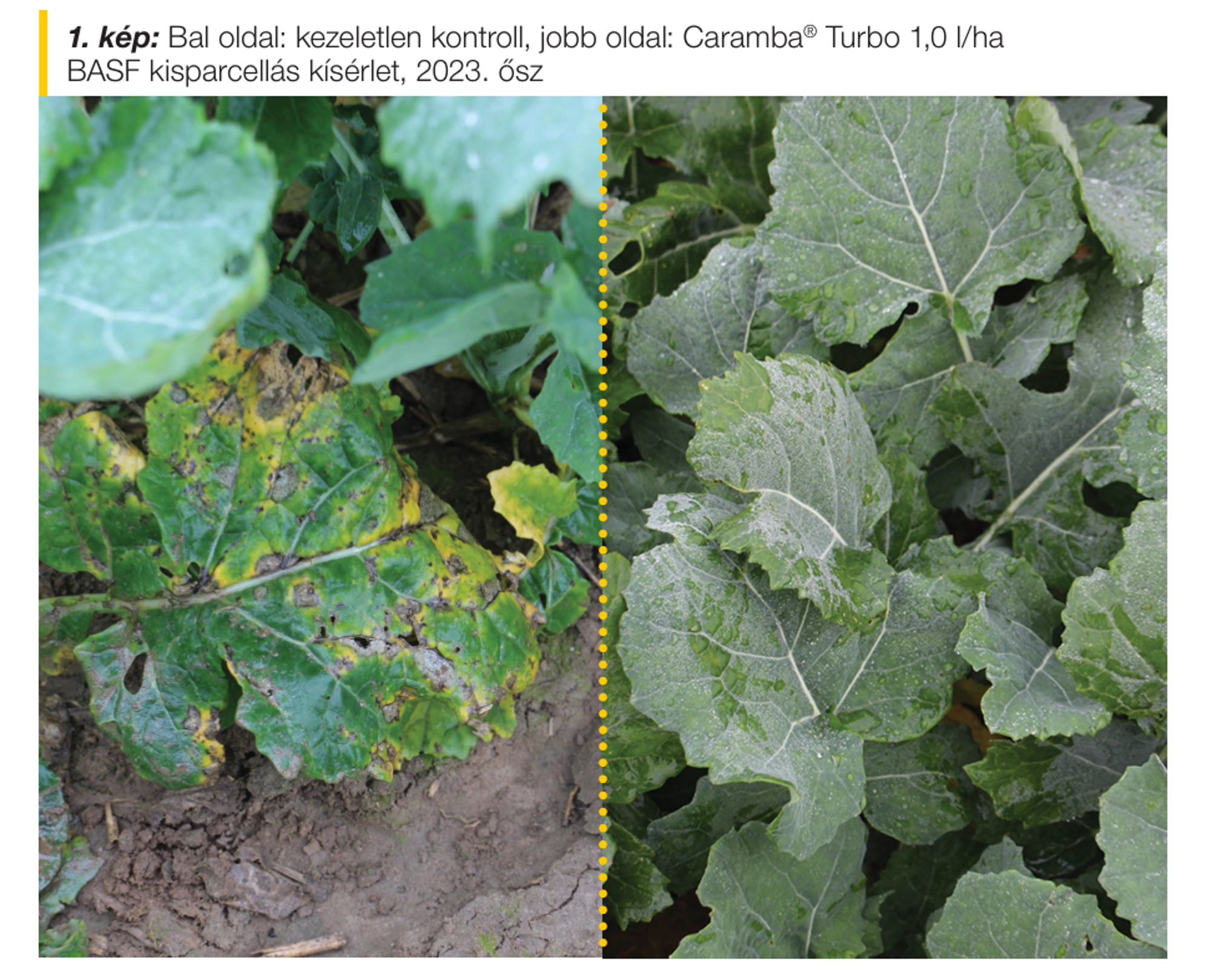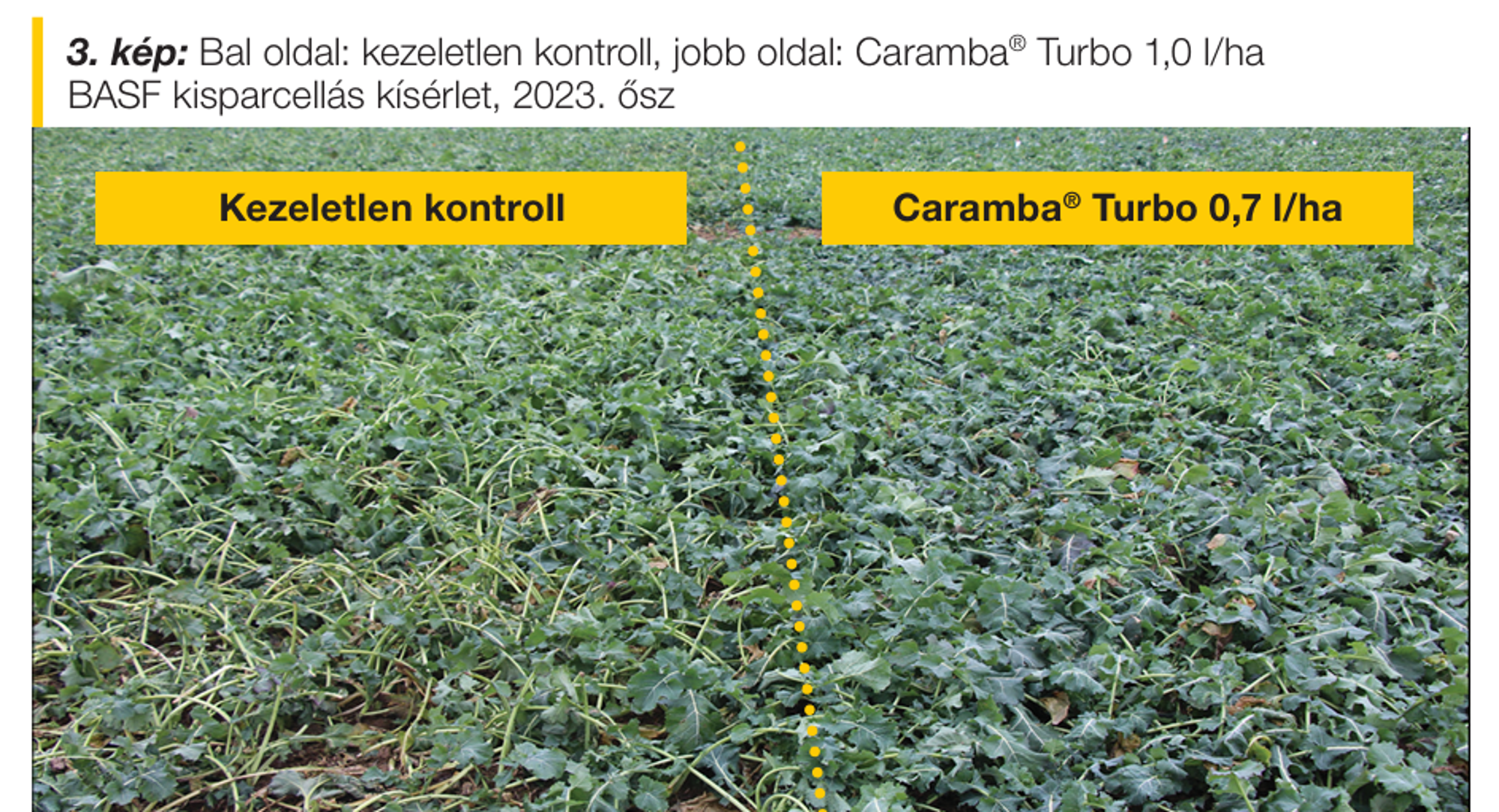 Az elmúlt évek hosszú, meleg őszi időjárása, különösen a korán elvetett repcetáblákon, sok esetben túlságosan nagy levéltömeg kinevelésére késztették a növényeinket. Ennek a levélzetnek egy igen jelentős része a téli időszakban sajnos veszteség áldozatává válik. Ennek megakadályozására szintén hathatós eszköz a Caramba® Turbo, hiszen a jól időzitett, azaz a repce 4–6 leveles állapotában elvégzett Caramba® Turbo-kezelés igazán hatékonyan képes csökkenteni ezt a levélveszteséget is (3. kép).