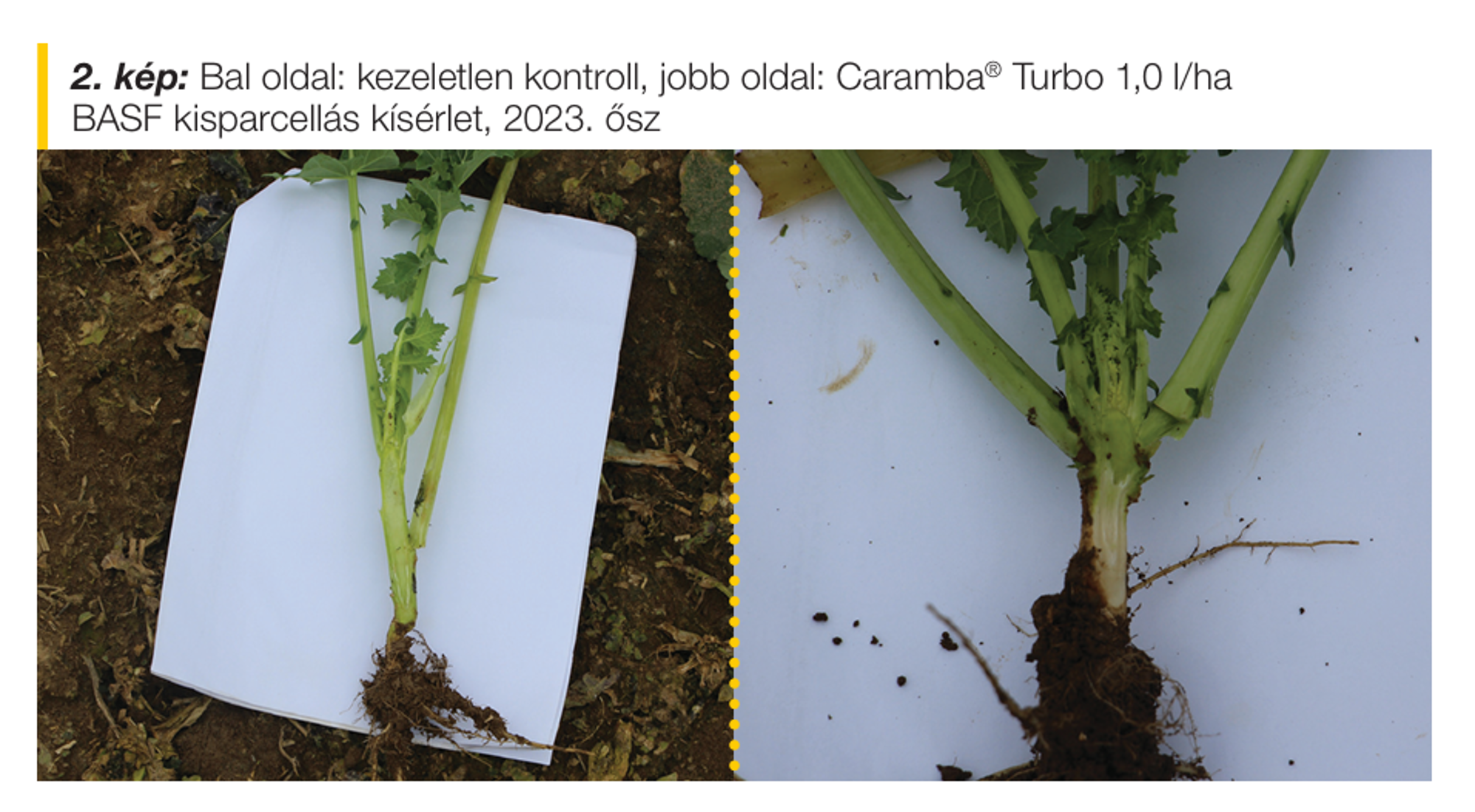 Az őszi kezelések célja a fóma elleni hatékony védelmen túlmenően a repce növekedésének hathatós szabályozása, melynek során vissza fogjuk a tenyészőcsúcs túlzott megnyúlását és a túl buja levéltömeg kialakulását. Így a Caramba® Turbo-val kezelt állományokban a felvett tápanyagok a vastagabb, tömzsibb gyökérnyaki részben koncentrálódnak (2. kép).