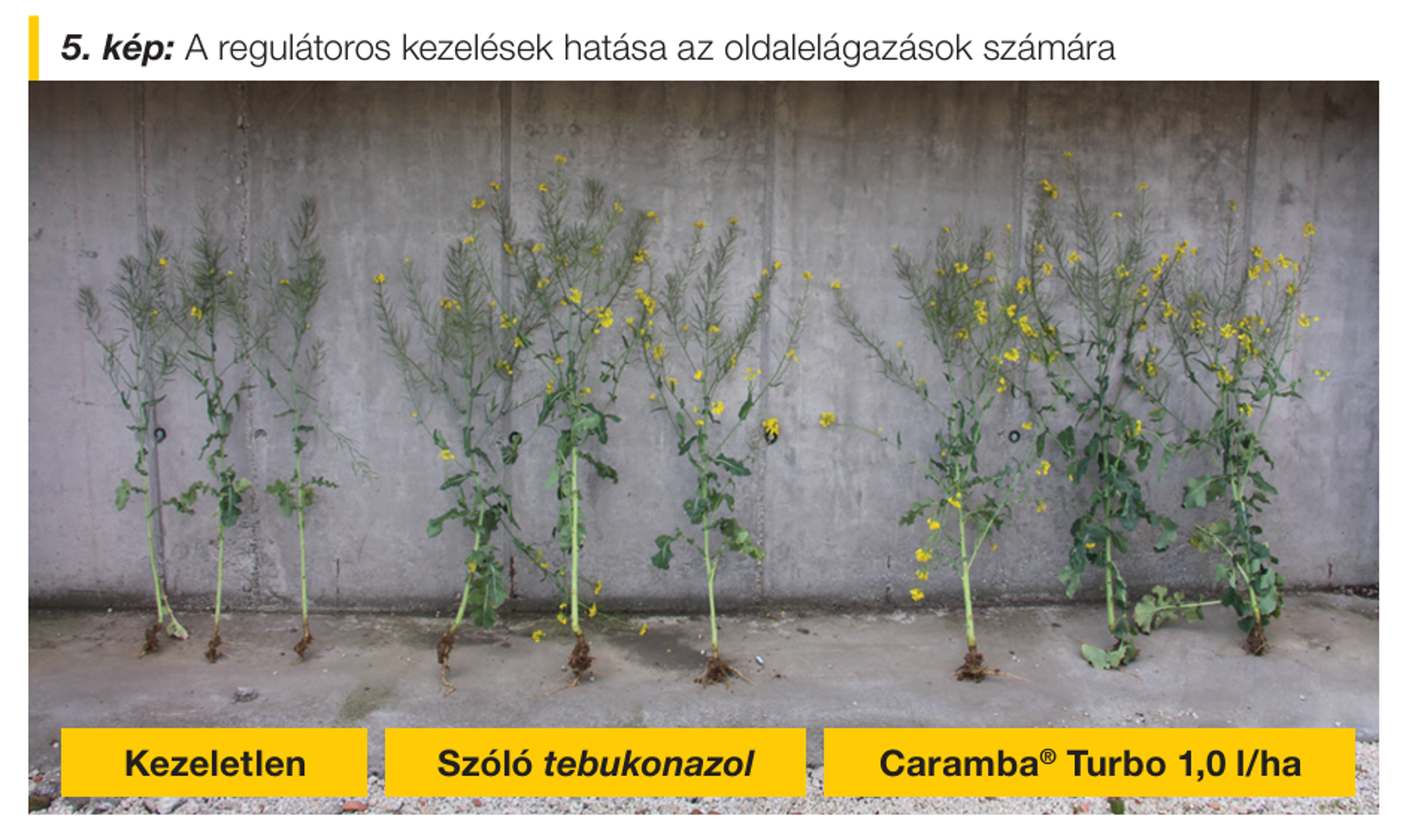 Ez után jöhet a tavaszi regulátorozás, amely során a hosszanti megnyúlásért felelős növényi hormon, a giberrelin bioszintézisét csökkentjük. Ezáltal a repcenövény az erőforrásait nem pazarolja a szár túlzott felnyurgulására, hanem az oldalhajtások kinevelésére fordíthatja. Az pedig mindanynyiunk számára ismert tény, hogy a repce termésének túlnyomó többsége az oldalelágazások becőiben képződik (5. kép).