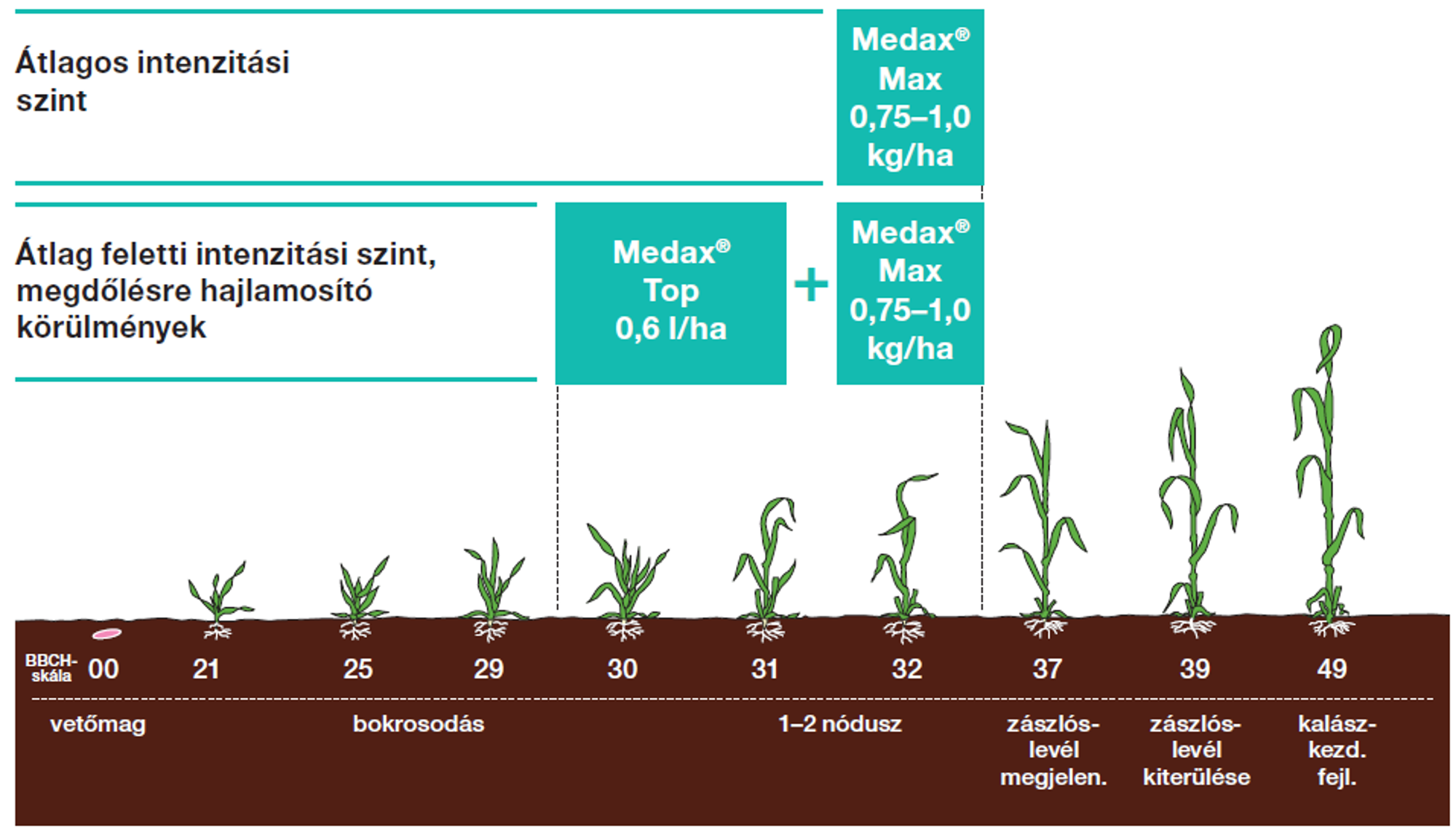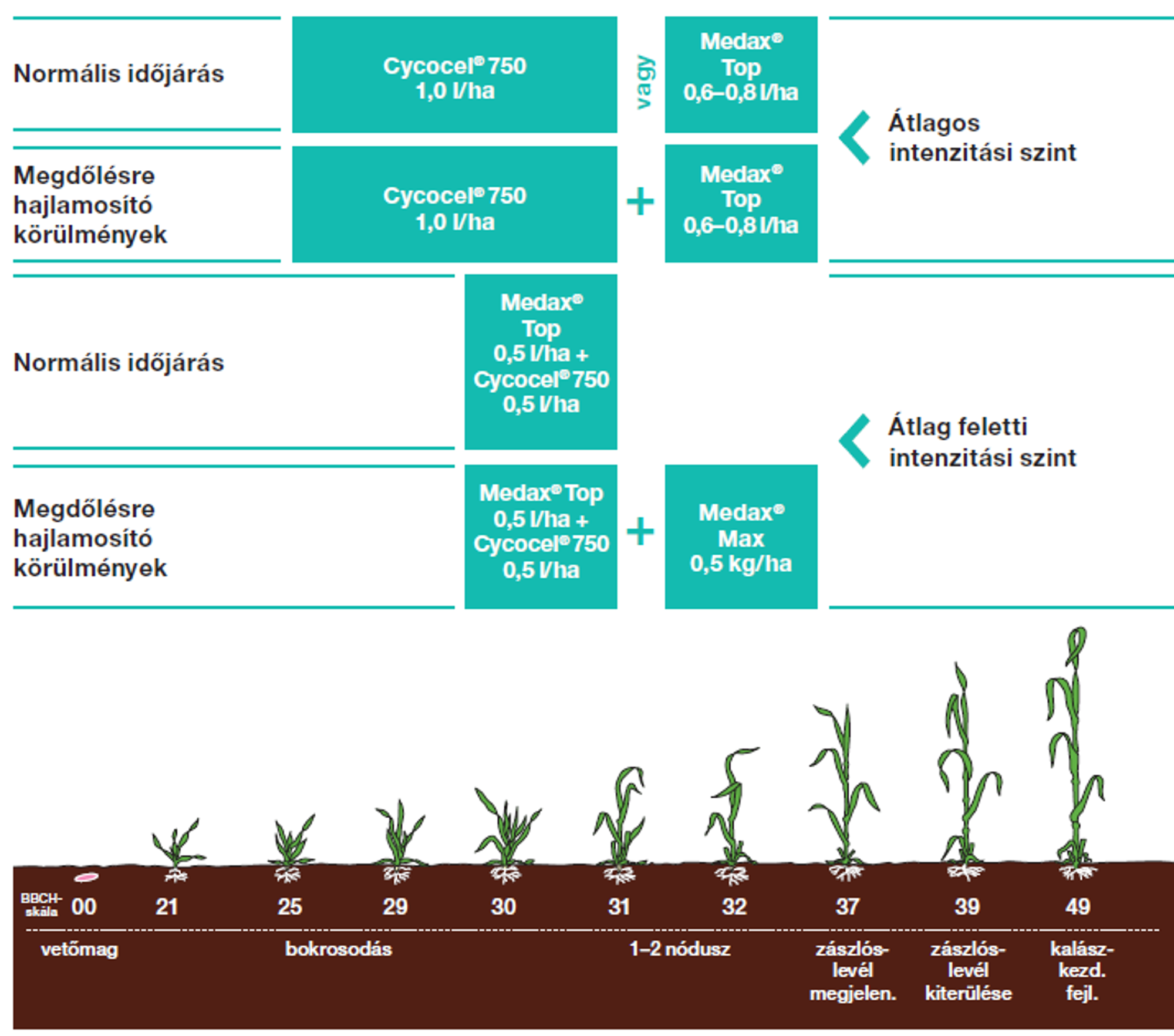 Az őszi búza állományában az átlagosnál nagyobb intenzitású termelés során, ha az időjárás kedvező az erőteljes, gyors növekedésnek, akkor a Cycocel® 750 és a Medax® Top kombinációja ajánlott a bokrosodás végén kijuttatva, 0,5 l/ha és 0,5 l/ha dózisban. Ha a körülmények a megdőlésnek továbbra is kedveznek, akkor 2-3 nóduszos állapotban a Medax® Max 0,5 kg/ha-ral kell folytatni. Átlagos intenzitási szintnél és kevésbé csapadékos időjárás esetén az első kezelésre elegendő a Cycocel® 750-et 1,0 l/ha-ban bokrosodás végéig vagy a Medax® Top-ot 0,6–0,8 l/ha-ban 2-3 nóduszban kijuttatni. Ha a körülmények később a gabona megdőlését elősegítik, akkor a korai Cycocel® 750-kezelés után célszerű biztosra menni, és a búza 2-3 szárcsomós állapotában a Medax® Top-ot 0,6–0,8 l/ha adagban kipermetezni. (2. ábra)